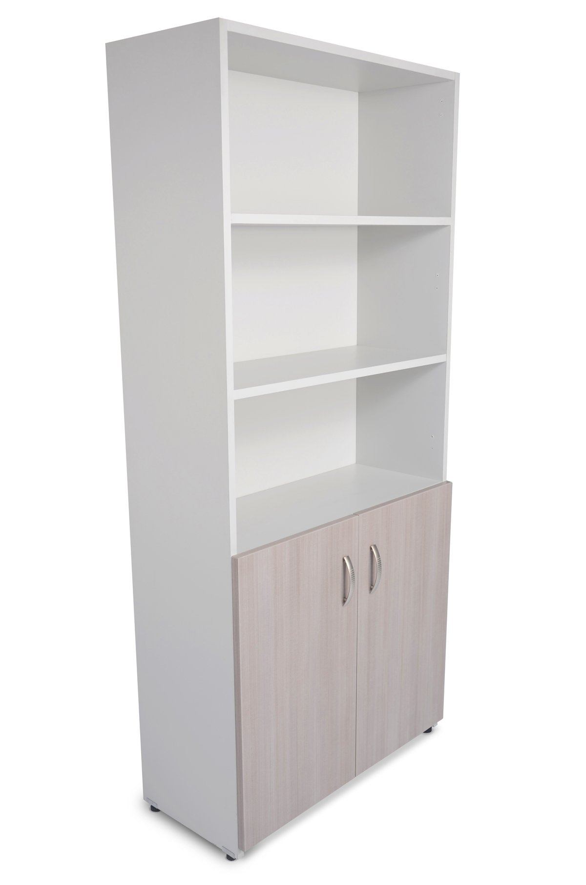 Librero con puertas inferiores fabricado en melamina 28mm, cuenta con entrepaños movibles, con acabados en todos los cantos en PVC de 1mm y niveladores.