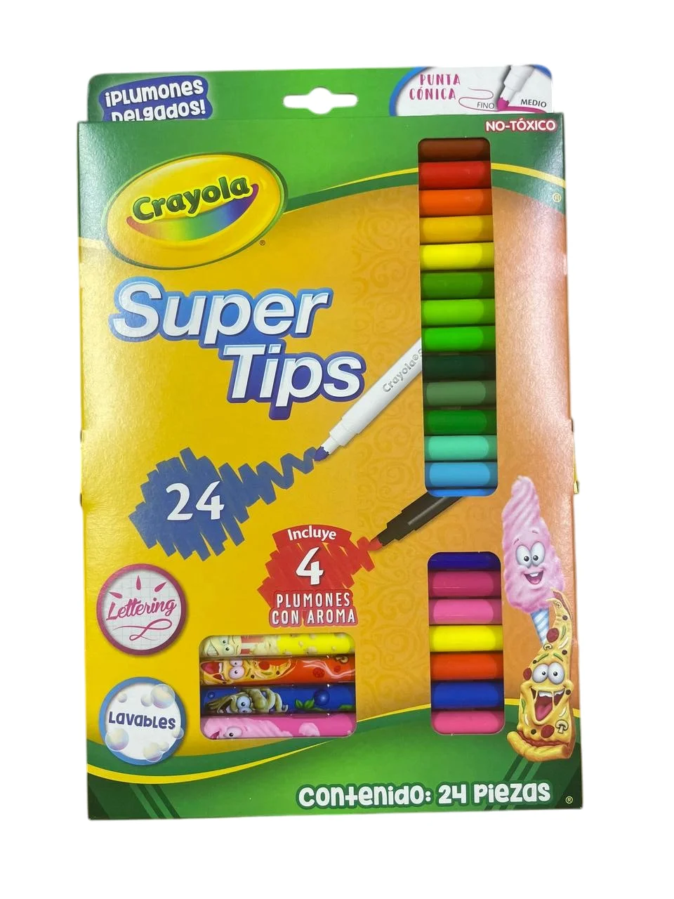 Los super tips de Crayola tienen una gran variedad de colores lavables, su punta versátil te permite dibujar líneas gruesas o delgadas. Su tinta de secado rápido evita que esta se escurra en el papel. Este paquete incluye 4 plumones con diferentes aromas: pizza, algodón de azúcar, bluberry y palomita de maíz.
