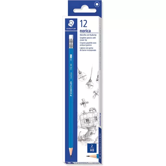 Lápiz de grafito hexagonal norica hb con goma blanca libre de látex, alta resistencia a la rotura. Caja con 12 piezas.