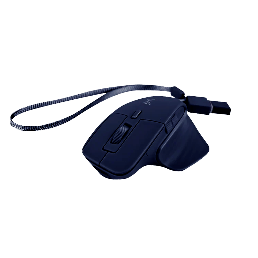 Mini ratón recargable, versátil gracias a su conexión dual (2,4 ghz + bluetooth) y receptor dual, con cable de carga y correa sujetadora.