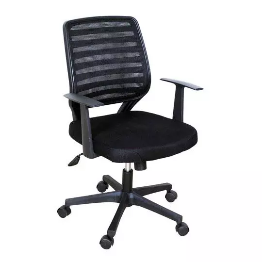 Color Negro con descansa brazos, base plástica. Dimensiones: ancho 60 cm, profundidad 55 cm, altura 92 cm. Palanca para bloqueo de rechinamiento brazos fijos y detalles en respaldo.